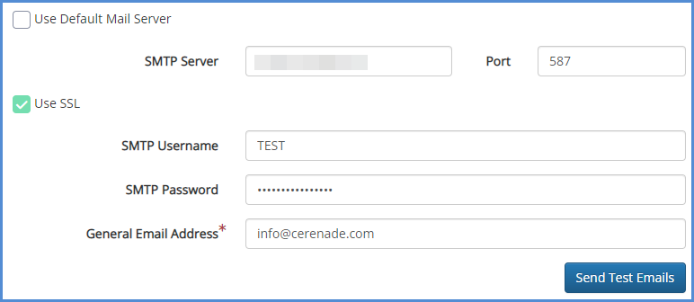 Fill out the open fields, and click Save. Note that if you do not have the appropriate data to input, you'll need to ask your IT team for the information as the team at Cerenade does not know any of the information for your office's Mail Server.