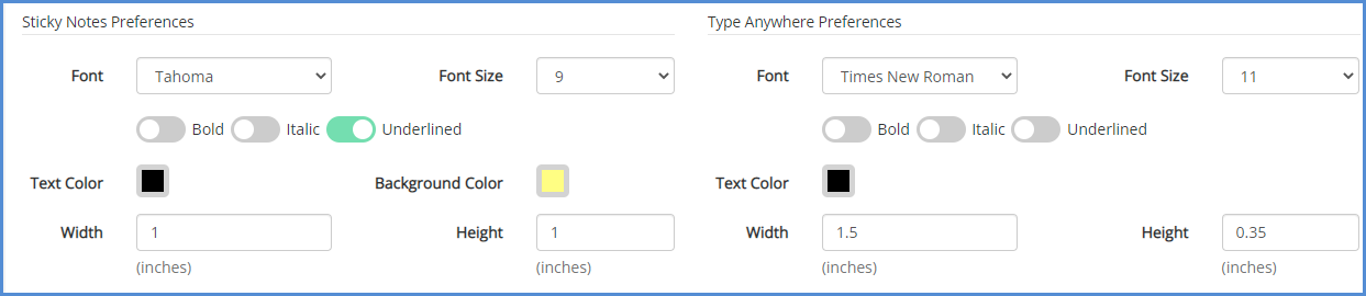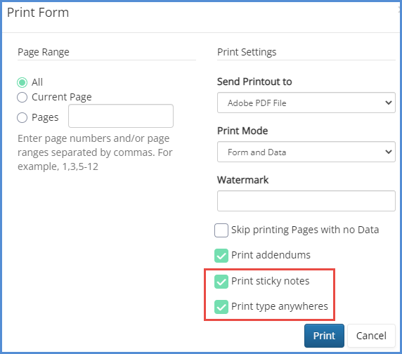 - When ready to print, you can choose to print or not print both the sticky note and type anywhere fields.