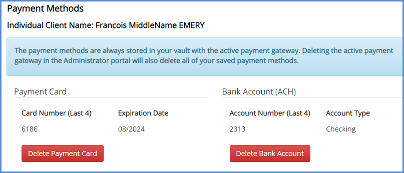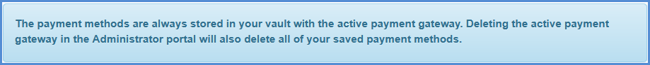 - NOTE: If at any point the payment gateway details (ie, either the LawPay or PayPal integration credentials) are deleted from the administrator portal, all stored payment details will also be deleted. This is also done for security purposes.