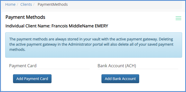- From the Payment Methods page, you can click on the Add Payment Card and/or Add Bank Account buttons to store the corresponding information.