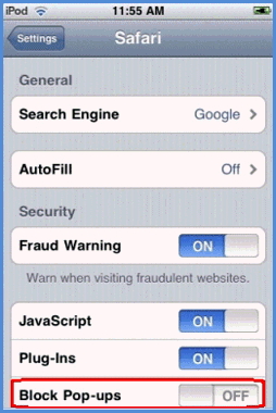 Disabling Safari's Pop-up blockers on an iPhone (also works for iPads and iPods) To disable pop-up blocking in Safari only while using WebSked, select the "Settings" icon on the iPhone's main screen, then select "Safari" from the menu list, as shown.