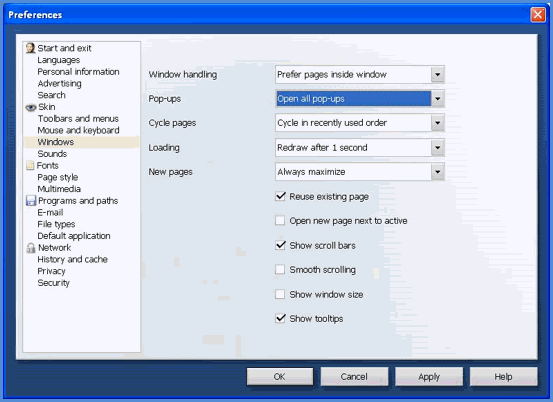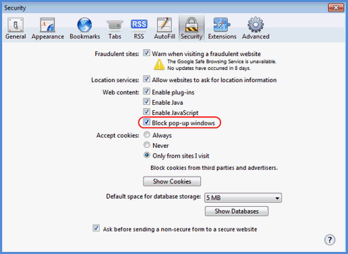 Block pop-up windows: Un-check this to disable the pop-up blocker altogether.