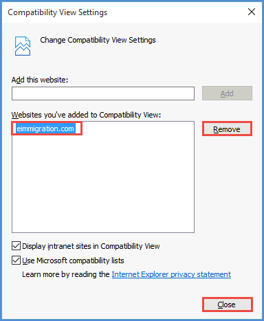 2. Under Websites you've added to Compatibility View, highlight eimmigration.com, and then click Remove. Click Close.