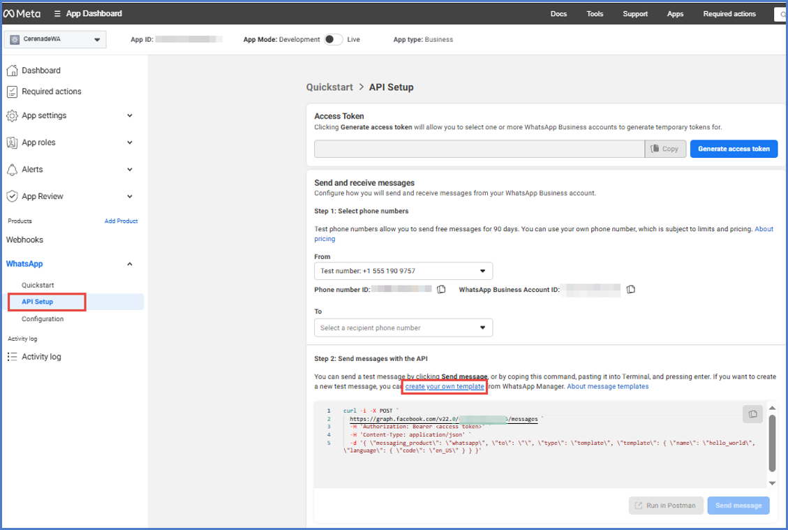 - Go to the WhatsApp tab in your Developer account select API Setup