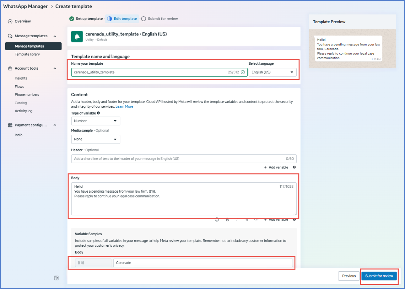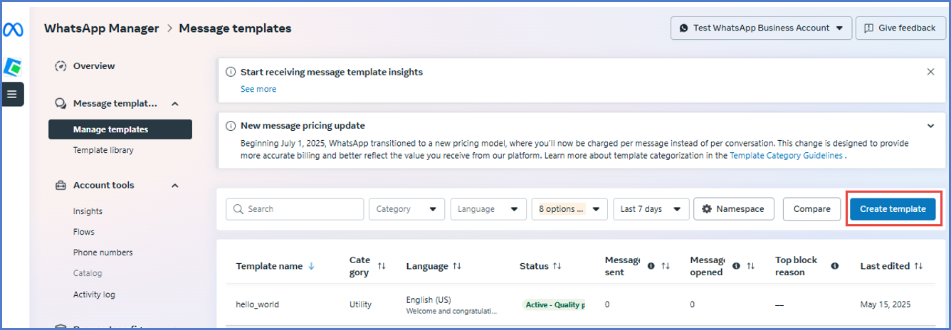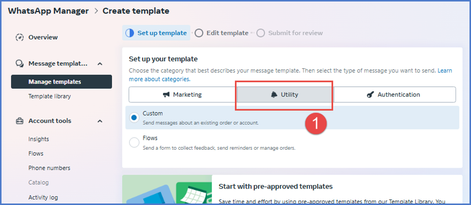 - Click “Create your own template” or go to: https://business.facebook.com/latest/whatsapp_manager/message_templates